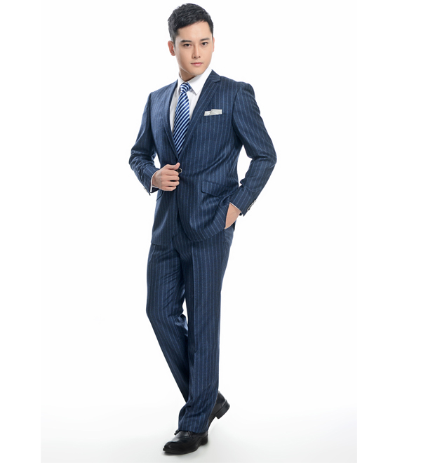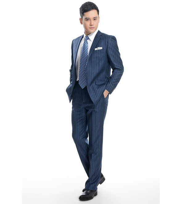蓝色条纹职业套装,给人一种大海的清凉感觉。同时面料又是采用高档纯毛面料,