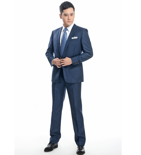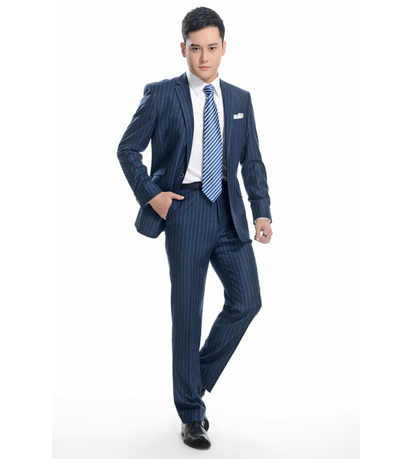 蓝色条纹职业套装,给人一种大海的清凉感觉。同时面料又是采用高档纯毛面料,
